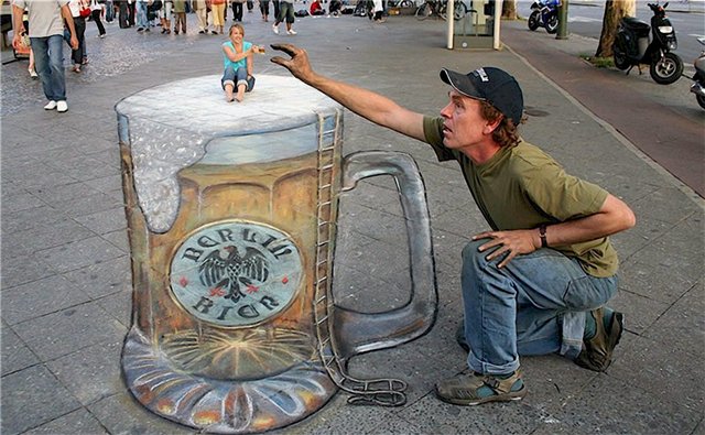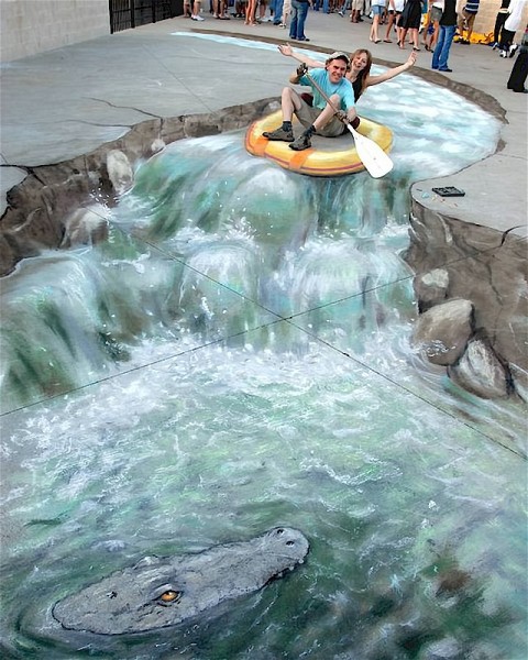 Британский художник Джулиан Бивер рисует мелом на тротуарах - росписи и нереально реалистичыне 3D изображения. Его рисунки создаются с применением проектирования и бросают вызов законам перспективы. Оптический обман так убедителен, что люди обходят, чтобы не попасть в выбоины которые он нарисовал на тротуаре.