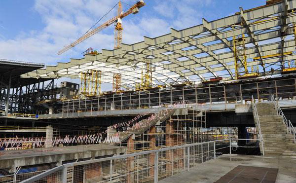 Подъем кровельной конструкции осуществлялся посредством четырех домкратов, масса каждого из которых составила 320 тонн. Эти агрегаты были установлены на стальных 34-метровых башнях. Крепление кровли к домкратам осуществлялось в четырех точках при помощи высокопрочных стальных троссов. Сейчас 760-тонная конструкция находится в зафиксированном состоянии, и перед специальстами НПО "Мостовик" стоит задача возведения под ней 31-й постоянной опоры. На последнем этапе выполнения работ необходимо будет смонтировать кровельное покрытие, светопрозрачные системы, а также завершить фасадную часть вокзала.