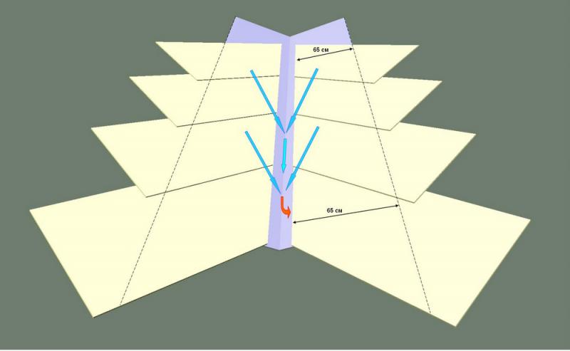 Фиолетовая плоскость - рулон плёнки, раскатаный вдоль ендовы(один слой. Светложёлтые - плёнка, приходящая со скатов.Нахлёст - 65см. Направление местного стока воды(конденсата)- голубые стрелки..... Красная - так должна потечь вода....для того, чтобы попасть под плёнку. Извените...но это вверх....а для этого должна быть причина. |