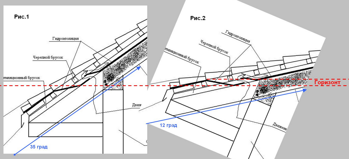 Честно говоря какой-то смешной торг. Вы доказываете что при уклоне кровли в 12 (или 15 как на рисунке) градусов схема работать не будет. Абсолютно согласен с вами. Более того я вообще полагаю что при таком уклоне подобный материал применять нельзя. Этот уклон критичен даже для фальцевой кровли. В данном случае наиболее правильной будет наплавляемая кровля.