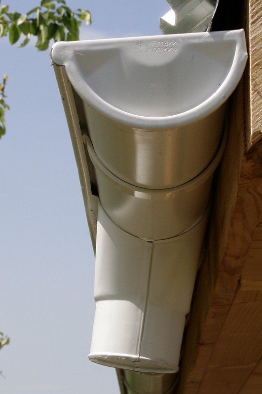 По водосточке - по фотографиям ощущение, что при монтаже задрали лицевой край желоба высоко. Завтра выложим фотографии примерно похожей сборки - все состыковано плотно и хорошо держится даже без заклепок. Воронку с 2012 года совсем не меняли.