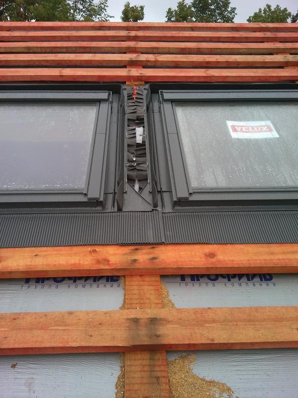 Сделать перехлест фартуков в подобной ситуации худо-бедно можно. Но качество такого соединения во многом зависит от того, какой именно кровельный материал используется. Наиболее "безопасными" в этом смысле можно назвать фалец и ГЧ. Но здесь, скорее всего, будет либо МЧ, либо профлист. И вот тут встает весьма непростой вопрос: как и чем перекрыть промежуток между окнами.
