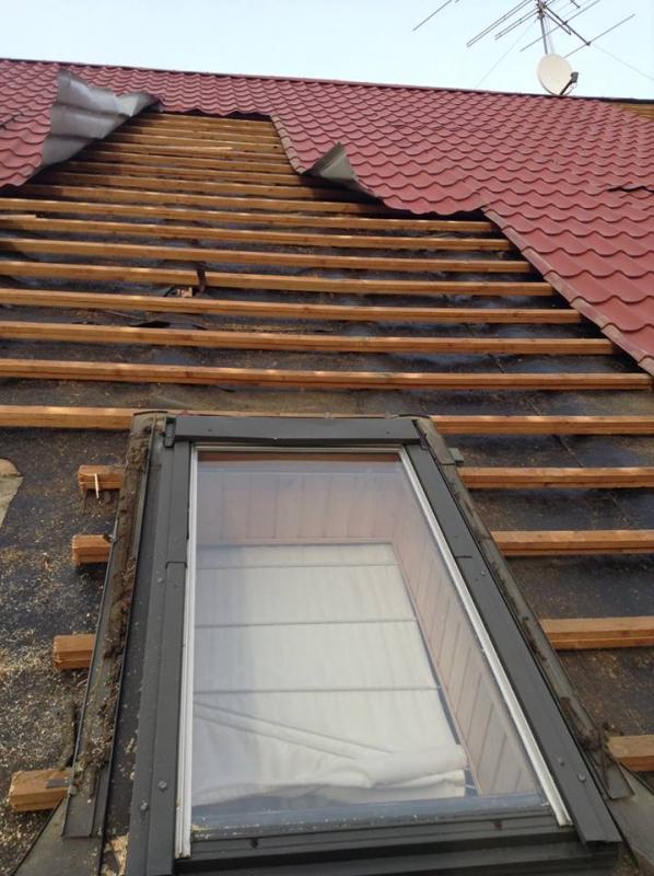 Полный демонтаж старой металлочерепицы, пергамина, утеплителя и пароизоляции из ПЭ-плёнки.