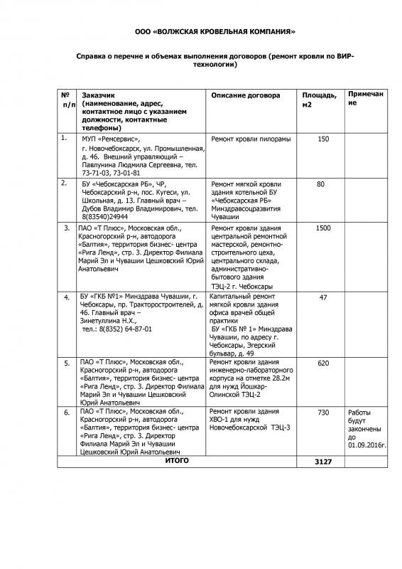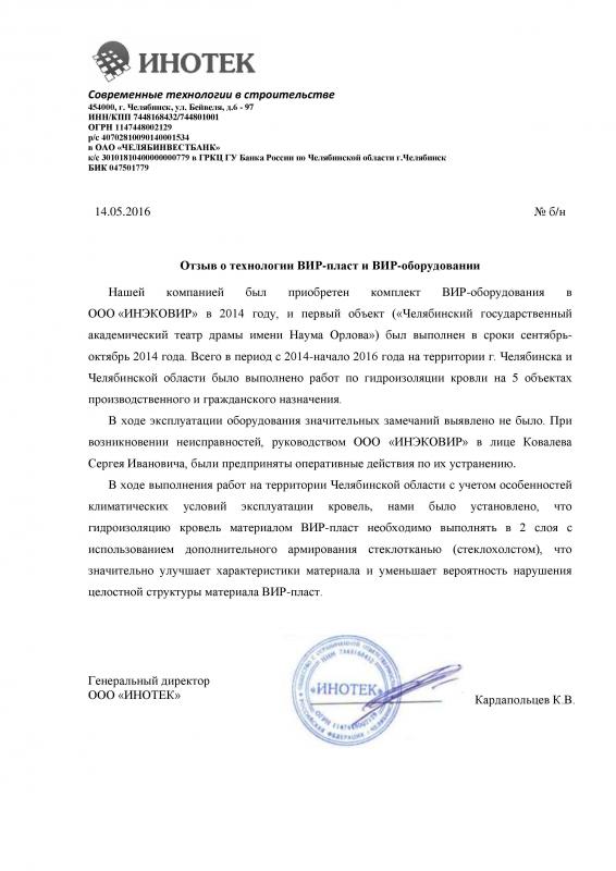 По словам руководителя Шашкова И.Н., в ближайшее время там появятся фотографии с выполненных объектов. Отзыв на работу по ремонту кровли с применением ВИР-технологии от Чебоксарской ТЭЦ-2 (заказчик ООО "ВКК") Вы можете увидеть Выше в данном топике. |