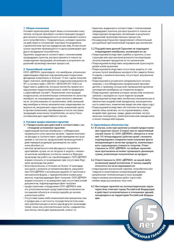 ООО ДЁРКЕН установило Расширенную Гарантию на подкровельные/ветрозащитные мембраны и пароизоляционные плёнки, предназначенные для использования в скатных крышах и стенах. Начало действия Расширенной Гарантии 01 Января 2017 г. На материалы Премиум-класса срок Гарантии составляет 15 лет, а на продукты стандартного класса 10 лет. Перечень продуктов, условия предоставления Гарантии и ограничения указаны в соответствующих Гарантийных Грамотах, которые можно скачать на странице http://www.doerken.com/ru/service/guarantee/index.php