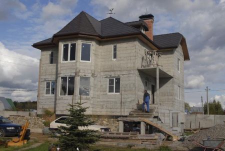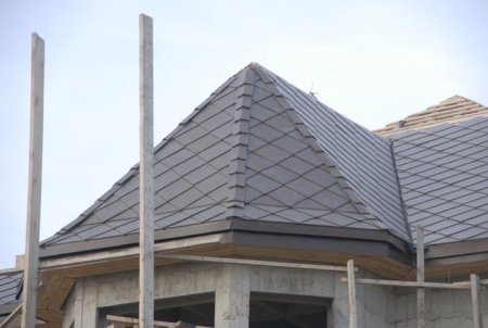 Оказывается, керамогранит в качестве кровли был выбран из-за экономии: вышло дешевле, чем из металлочерепицы. Форумчанин купил напольную плитку 40×40 см, имитирующую натуральный сланец.