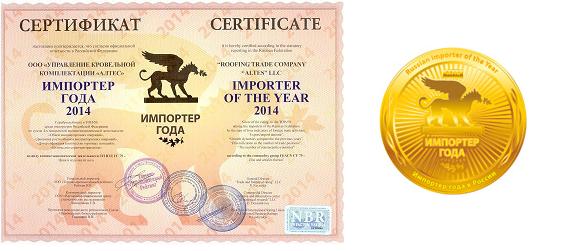 С огромной гордостью сообщаю, что ООО УКК «Алтес» получила звание ИМПОРТЕР ГОДА – 2014 и серебро рейтинга в ТОП-50 среди импортеров Российской Федерации и премирована Международным сертификатом «Импортер Года – 2014» и Настенной медалью «Импортер Года - 2014». Регалии заняли самое видное место в нашем офисе, поэтому заглянув к нам в гости, вы можете ими полюбоваться и разделить нашу радость и гордость – ведь мы заработали эту награду благодаря вам. СПАСИБО!
