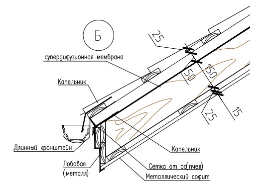 Добрый день, вопрос немного не по теме, но все же. Возвели несущий каркас кровли, возник вопрос по узлу(прикрепил чертеж). Как лучше выполнить его, по варианту "А" или "Б"? Думается, что по варианту "Б" будет лучше вентилироваться вентзазор, но немного не понимаю как выполнить тогда переход лобовым металлом на фронтон. Буду благодарен за помощь.