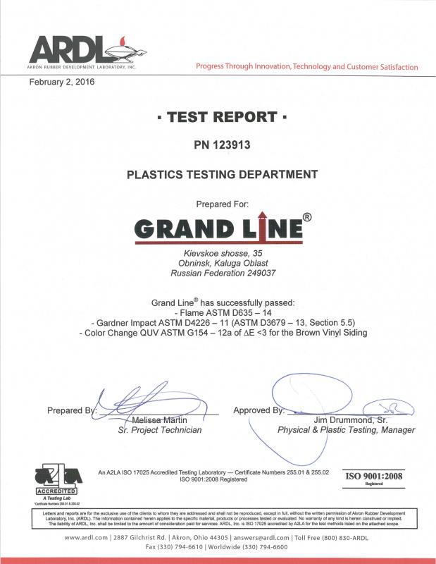 Компания Grand Line в 2015 году прошла независимую сертификацию виниловых изделий в Akron Rubber Development Laboratory, Inc. (ARDL), и первой из российских производителей сайдинга смогла показать сертификат с информацией о результатах тестирования.