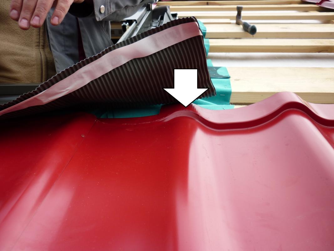 Neewel, ну тут проста так получилось... если б окно установили чуть ниже, то пришлось бы листы перехлестывать на волну ниже... точнее окно мог оказаться или выше или ниже этой линии. тогда перехлест на лишнию волну. и эту "волну"на двух листах на каждое окно закладываю заранее, когда материал считаем. потому как не знаешь куда окно врежется. а если на готовую кровлю врезать окно, то может понадобится по две волны на каждую сторону.