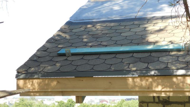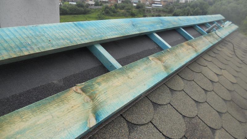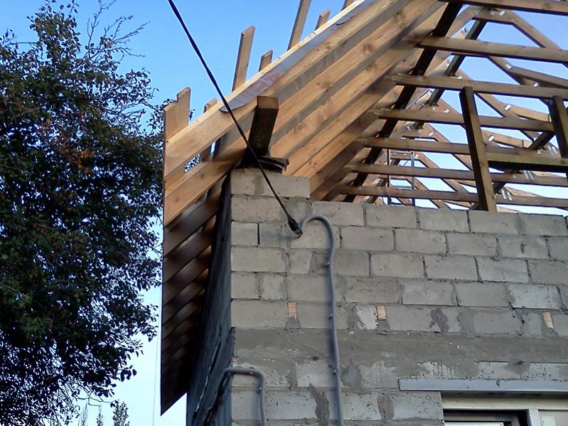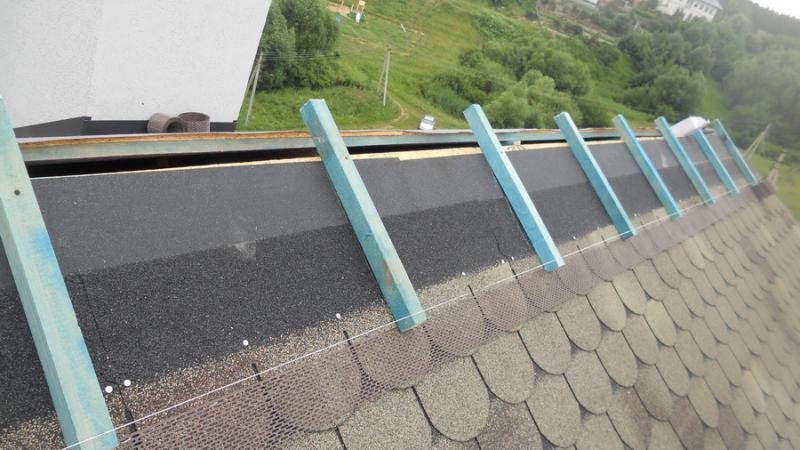 К коньку с интервалом в 1 м. крепятся веревки с карабинами на концах. Лазить соответственно в обвязках, перещелкиваясь с веревки на веревку по ходу движения вдоль ската, наступая при этом на только что смотнированную обрешетку.