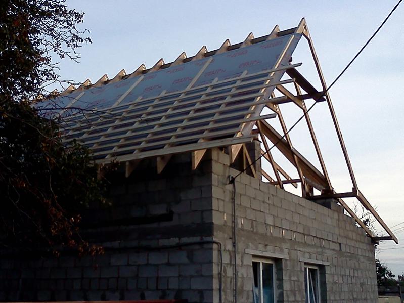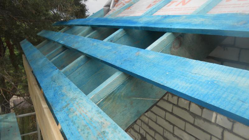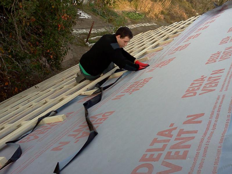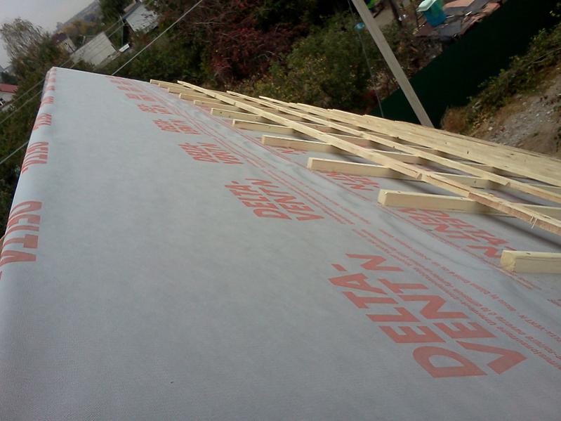 1. Совет опытных: В каком направлении стелить дифку? кусками контрбруса какой длинны ее удобнее крепить? Можно ли сразу набивать обрешетку, чтобы можно было наступать на нее, двигаясь вверх? Мое видение: Раскатываем рулон поперек стропил (начиная от карниза), обрезаем его, крепим временно скобами к стропилам, раскатываем следующую полосу выше с нахлестом 10 см., обрезаем, крепим скобами, набиваем контрбрус кусками по 2-3 метра, сразу набиваем обрешетку отрезками по 6 метров. Наступая на обрешетку, повторяем действия выше. Уклон ската 45 градусов.