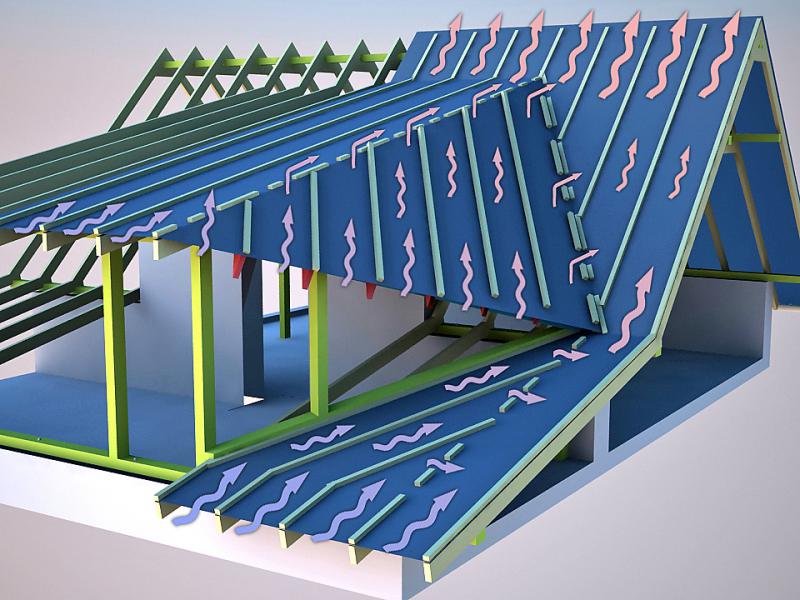 Друзья, помогите определить право на жизнь ниже приведенного варианта вентиляции подкровельного пространства. Можно ли класть контрбрус в разбежку кусками по 15 см? Не ослабит ли это конструкцию? Достаточно ли будет получившихся "окон" для вывода пара и избежания воздушных мешков?