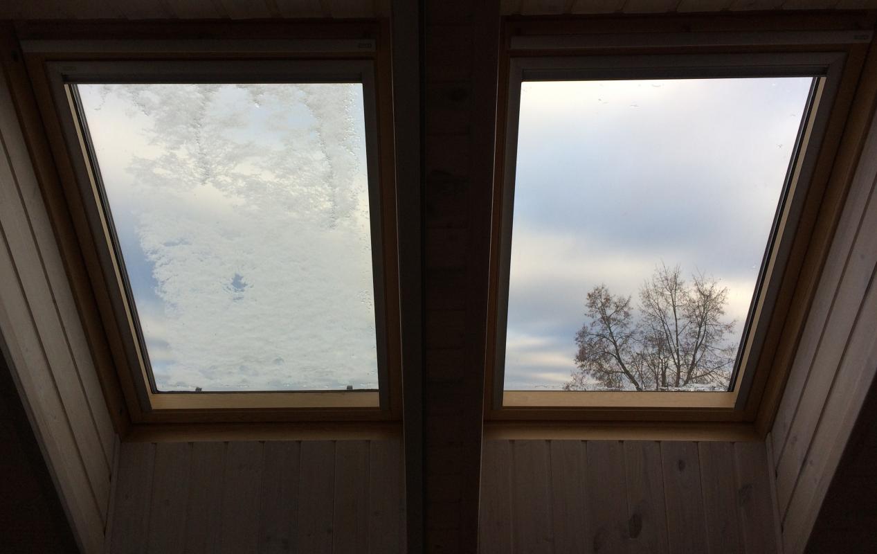 Наглядная иллюстрация разницы между одно- и двухкамерным стеклопакетами в мансардных окнах, установленных рядом в одну и ту же крышу.