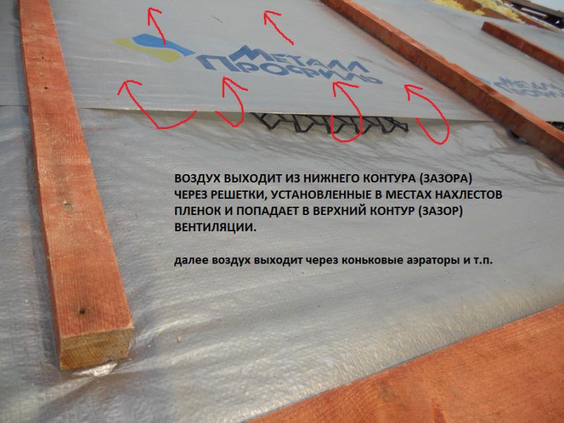 2) Убедитесь,что внизу,на карнизе,у вас есть приточные щели,то есть воздух заходит в продух между пленкой,контрбрусом и обрешеткой под металлочерепицу,образованный как раз этим контрбрусом,а не закрыт желобом,карнизной планкой,подшивкой лобовой доски и т.д.