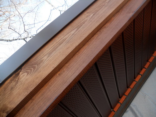 Подшивка карнизного свеса из алюминиевого полностью перфорированного софита ГЕНТЕК и лобовой доской из древесины.