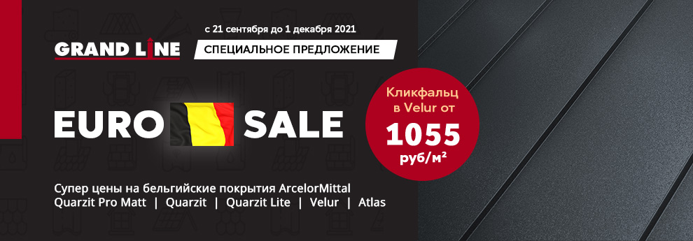 Рады сообщить, что с 21 сентября действует специальное предложение на бельгийские покрытия ArcelorMittal: Quarzit Pro Matt, Quarzit, Quarzit Lite, Velur, Atlas В рамках предложения снижены розничные цены на профилированную продукцию, например, Кликфальц доступен всего за 1055 руб/м2 Спец. предложение действует на всю профилированную продукцию в т. ч. штакетник и не распространяется на доборные элементы, дымники, колпаки, кожухи, жалюзийные ограждения. Цены могут отличаться в зависимости от региона Предложение действует до 1 декабря 2021 года |