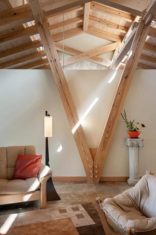 Попалась в Фейсбуке фотография мансарды, где хорошо реализован принцип, да и сам узел подпорной стойки конструкции крыши. Делюсь с Вами: