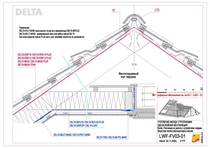 Можно начинать немного беспокоиться, если саморез прошёл мимо деревянного основания, и остался "торчать" из плёнки. Но что касается DELTA-REFLEX и DELTA-DAWI GP - это плёнки высокой плотности из первичного полиэтилена, даже в этом случае во всех наблюдаемых случаях не возникало проблем с конденсатом. Плёнка всё равно плотно обжимала саморез и мы не наблюдали локальной конденсации водяного пара. Тем не менее, в каждом конкретном случае могут быть свои индивидуальные особенности, и мы рекомендуем выкрутить саморез (если вы промахнулись) и заклеить отверстие лентой. Между отделкой потолка и плёнкой остаётся не вентзазор (т.к. нет циркуляции воздуха), а просто воздушный зазор, где прокладывается электрика. Второй вопрос - если плёнка обладает достаточной прочностью, провис будет минимальным, и никаких проблем не будет. Просто надо выбрать КАЧЕСТВЕННУЮ пароизоляцию.