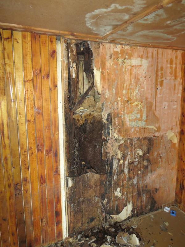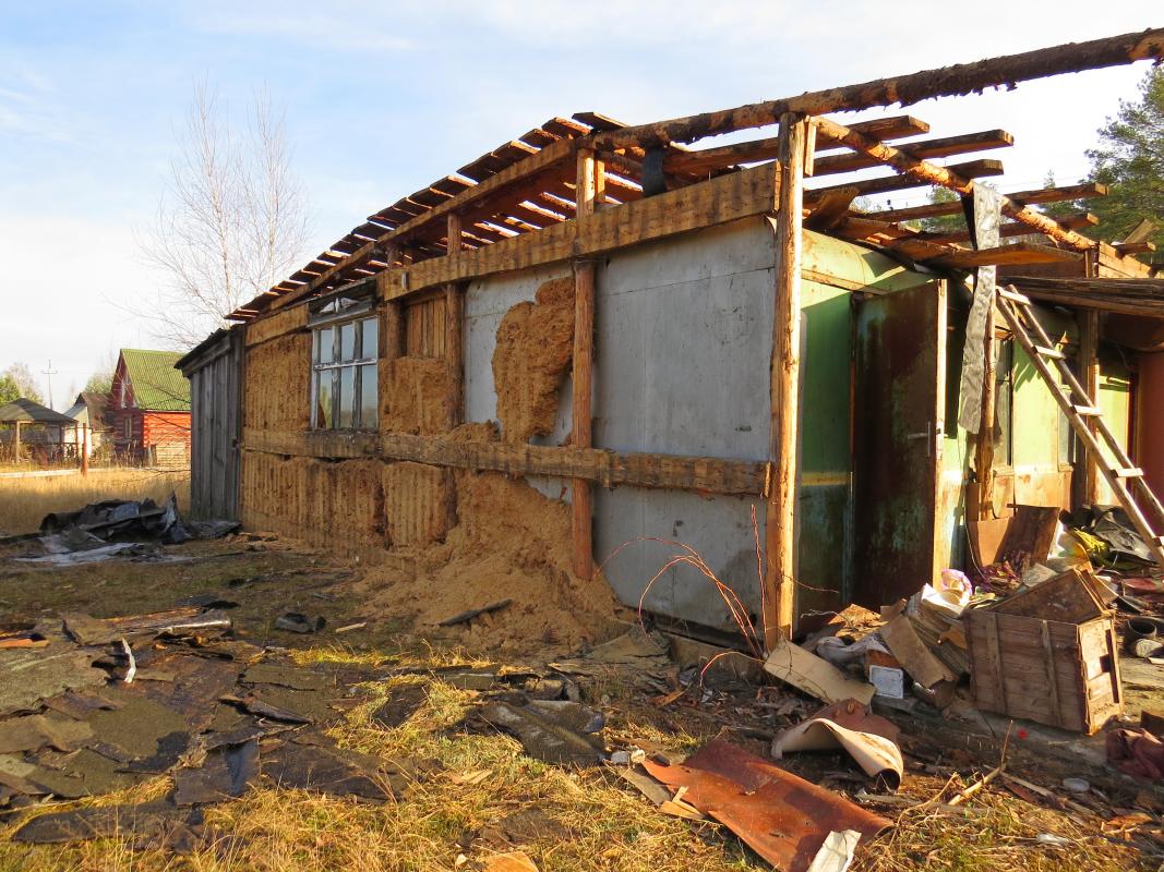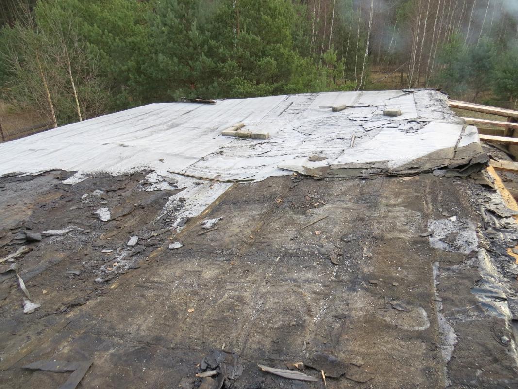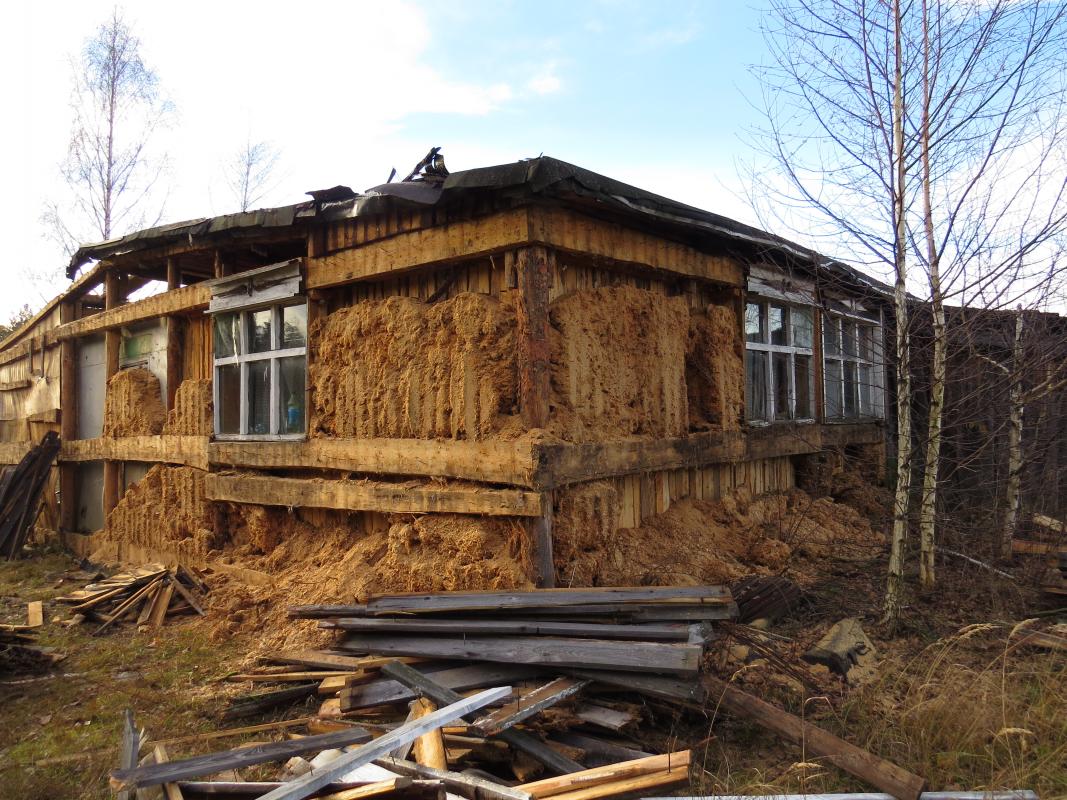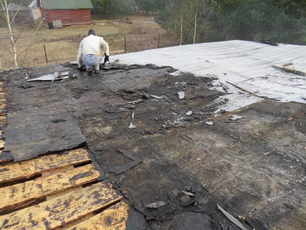 В общем скажем так : Каркасный домик 11х11 м примерно 1983г.р., или раньше... Он был построен в качестве столовой для газовиков... Стены: пирог (снаружи - внутрь)доска 25мм - 200-250мм опилки - доска 25мм - гипсокартон 12мм - вагонка 12мм.(Пароизоляции нет). О состоянии можно судить по фото (снята наружная доска).... Принцип кровли тоже виден.... Кровля: - холодная (чердак в коньке гдето около 100-130см от перекрытия - перекрытие на базе бруса 100х100мм (шаг около 2м).... подшито обрезной доской (потолок, к нему снизу прибит оргалит), между брусами лоханкой лежит назовём пароизоляция (склееная только между собой) , насыпан слой опилок 10-15см ( слежался) - стропилка: Необрезная доска 250х50мм (лёжа, шаг около 2м) - обрешётка: Необрезная доска (кора Несчищена, ничем Не пропитана - к размышлениям об антисептиках, жуковых ходов НЕТ)...достаточно частая. Покрытие кровли: 1.пергамин по обрешётке 2."Самоклеящийся Синтетичиский Подкладочный" ковёр 3.Рубероид - 4.Рулонный материал с посыпкой на стеклохолсте (это уже более позднее покрытие...но лет 15 ему точно) Там где кровля текла - всё в труху(или почти в труху - это когда доска выглядит прилично, но ломается руками 25 ка). Где не текла - как говорится бери доску и прибивай куда нибудь. Кстати о "прибивай" - гвозди замучаешься выдирать (это в адрес "саморезчиков"). Верхний слой (тот который с посыпкой на стеклохолсте) - хрупкий.... т.е явных дыр на нём нет (кроме мест, где кровля просела)...местами спозший (складки поперёк ската на фото). Иногда отрывается пластами (едино с рубероидом под ним)...возможно, что это в связи с нагревом при укладке. Пару слов о "фундаменте". Брёвна - стойки около 15см в диаметре тупо врыты в землю..... там они ест-но отгнили, но выше....бревно в приличном состоянии и может быть использовано (если гвозди повыдирать |