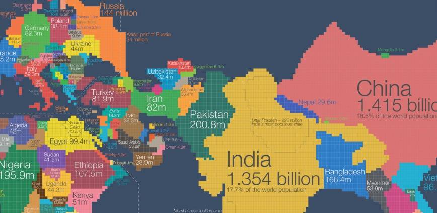 Размер страны на картинке зависит от количества населения. Каждый пиксель 500 тыс. человек. Вот и представьте!