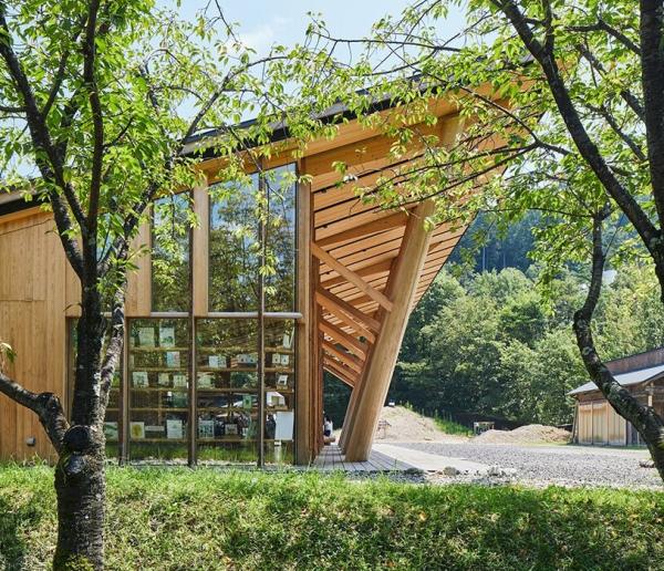 Проект такого необычного строения был разработан для академии лесных наук и культуры Гифу. Заведение построено из 100-летних японских кипарисов в сочетании с кедровыми досками, используемыми для дверных косяков и стоек. Эти доски сохраняют свою кору и видны как часть фасада здания.