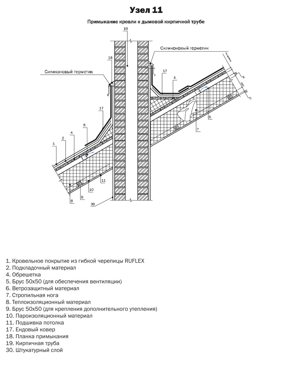 Узел 11 - Примыкание кровли к дымовой кирпичной трубе