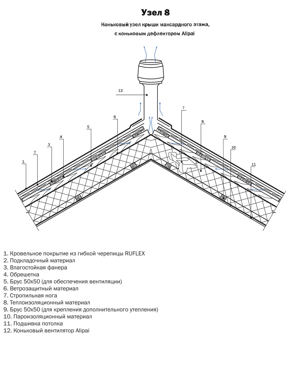 Узел 8 - Коньковый узел крыши мансардного этажа с коньковым дефлектором Alipai